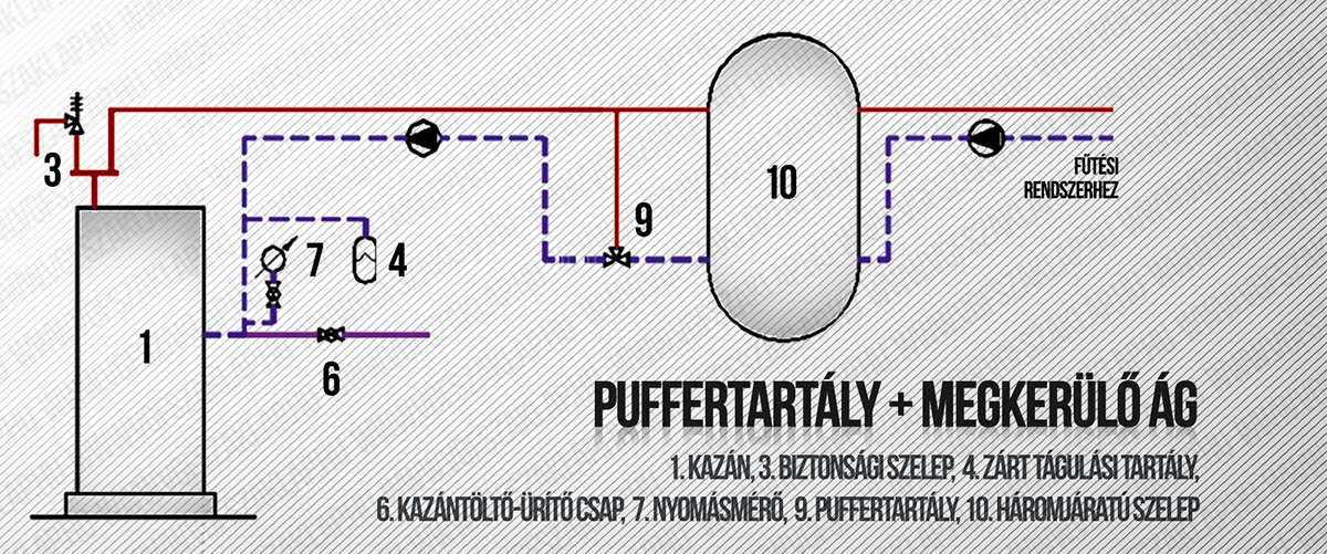 Viszonylag a legköltségesebb megoldás, de a legkevésbé drasztikus, és a fűtést is egyenletesebbé teszi. Az előbbi esetekben a kazánban lévő fűtővíz hőmérséklete folyamatosan változik. Amikor megrakjuk a kazánt, akkor a hőmérséklet megemelkedik, amikor pedig már kezd leégni a tüzelőanyag, akkor lehűl. Nem igazán jó a lakásban a nagy hőingadozás, mert az emberi szervezet a 2 °C-nál nagyobb eltéréseket már nem tolerálja. Puffertartály beépítésekor a nagyobb mennyiségű vizet nem tudjuk felforralni a kazán erős megrakásával, s a tárolóban lévő víz is lassabban hűl le, azaz egyenletesebb lesz a fűtővíz hőmérséklete. A tartály bekötése a kazán és a fűtési rendszer közé esik (3. ábra).