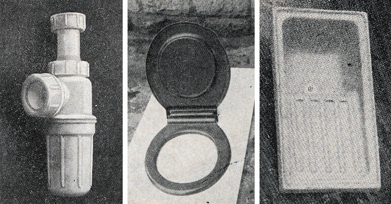„Üvegszál erősítésű poliészter gyantából eddig kb. 20 db 170 cm hosszú beépíthető fürdőkád készült. Egy db súlya kb. 12 kg. Ezek közül néhányat 1961-ben beépítettek üzemi használatra a Széchenyi, Császár és Kürt utcai fürdőkbe. Van már olyan kád, amelyben fél év alatt 1700-nál többször is fürödtek és meghibásodás nem volt. 1700 fürdés lakásban kb. 20 évi használatnak felel meg. (...) PVC-ből 1959-ben a Műanyagipari KTSZ készített néhány WC tartályt préslégformázással, hagyományos belső szerkezettel. Ezek közül egy az ÉTI-ben fel van szerelve, azóta is jól működik. 1962-ben további 4 db PVC WC tartályt szereltünk fel. Most van kialakulóban a PVC WC tartály nagyüzemű gyártása nálunk. WC ülésdeszkát a Kábelgyár fenoplasztból már régebben készített, amely azonban magas ára miatt nem tudott elterjedni. A Műanyagipari KTSZ PVC lemezből vákuumformázással gyárt WC ülőkét Panama-csészére.”