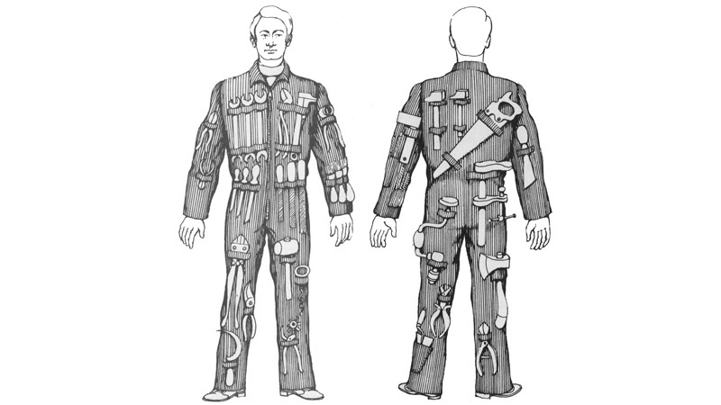 Rendkívüli kapacitású munkaruha. A forradalmi jelentőségű munkaruha végre megoldja a sok szerszám elhelyezésének gondját. Merész tervezése lehetővé teszi, hogy a barkácsoló, a szakmunkás vagy az iparos összes szerszámát magával hordozza.