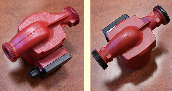 A két vizsgált termék között a legszebetűnőbb különbség, hogy a másolaton a kapcsolódoboz a szivattyú jobb oldalán került elhelyezésre, míg ez az eredetin bal oldalon található, emellett az elektromos bekötésre szolgáló tömszelence felfelé áll, az eredetivel ellentétben, ahol ez lefelé néz. Ugyanígy a fokozat állító kapcsoló is ellentétes oldalon helyezkedik el, az eredetin fent, a másolaton lent. A szabályzó elektronikát rejtő kapcsolódoboz színe sem egyforma, míg az eredetin a szivattyű színével megegyező bordó, addig a másolaté fekete.