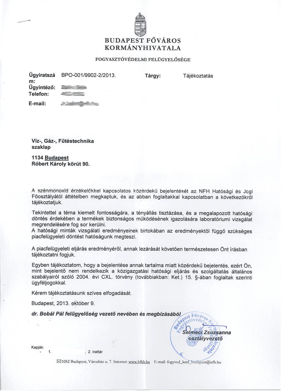 A szeptemberi lapszámunkban megjelent szén-monoxid érzékelőket vizsgáló cikkünk sikeresen hívta fel a figyelmet egy létező problémára. A Fogyasztóvédelemnél is megtettük a bejelentésünket, amire most meg is kaptuk a választ. A Fogyasztóvédelem kiemelt fontosságúnak tekinti az ügyet, és lefolytatja saját laboratóriumi vizsgálatát. A levelet teljes terjedelmével közöljük is.