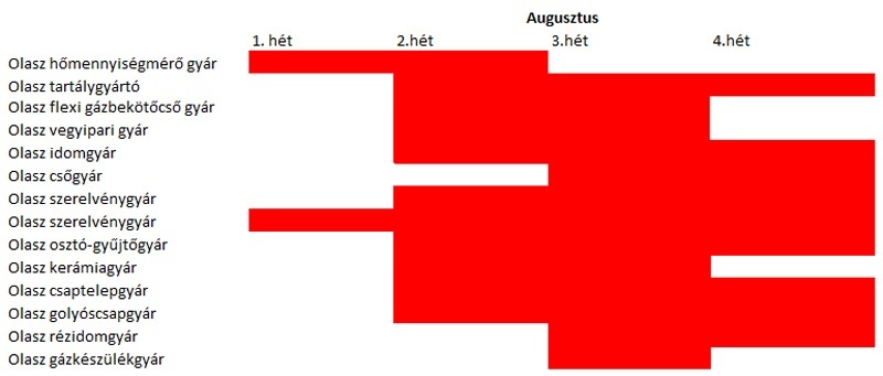 A legdrasztikusabb és koncentrált leállás az olasz iparban tapasztalható. Az olaszok hagyományosan augusztusban járnak vakációzni. Ehhez alkalmazkodtak a vállalatok, így a legtöbb gyárban teljesen leállnak 2-3 hétig, még a telefont is automata válaszolja meg. Mivel hazánkban jellemző az olasz gyártmányú gépészeti termékek kínálata, így komoly tervezést és készletgazdálkodást jelent ez a hazai nagykereknek és kiskereknek egyaránt. Az egyedi rendelésű termékek szállítási ideje akár kétszeresére is nőhet, de nem ritka, hogy a járatos termékek beszerzése is átcsúszik szeptemberre. Ezzel érdemes számolnia a kivitelezőknek és javaslom az ajánlatuk elkészítésénél érdeklődjenek kereskedő partnereiknél az olasz gyártmányú termékek elérhetőségéről, mielőtt határidős munkát vállalnak.