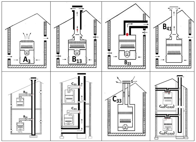 a gázfogyasztó készülékek telepítésének és átalakításának típusaitól függő egyedi előírásai fejezetében a gázfogyasztó készülékek telepítésére vonatkozó ábrákon a gázfogyasztó készüléknek azokat a tartozékait, amelyek közvetlenül részt vesznek az égésilevegő-ellátásban, vagy az égéstermék elvezetésében, és azokat nem a gázfogyasztó készülék részeként tanúsítottak, vastag fekete vonal jelzi.