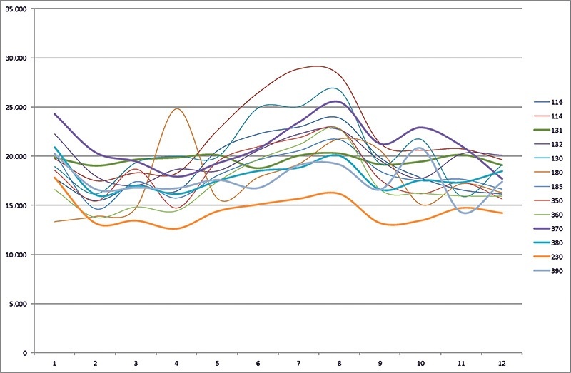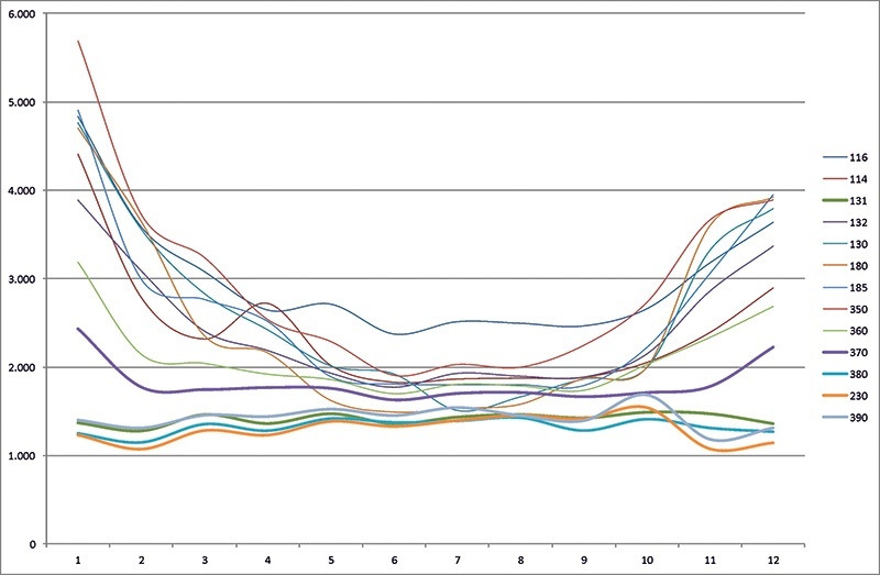 A 131, 230,380 és 390-es házakban valósult meg valamennyi optimalizálási lépés. Jól látható, hogy a gázfogyasztás grafikonon e két háznál „eltűnt” a fogyasztás téli hullámzása. A szinte konstans egyenes érték az ételkészítés nagyjából egyenletes fogyasztásából adódik. De ami még ennél is érdekesebb, hogy villamos fogyasztás oldaláról szinte nem is lógnak ki ezek a házak a többi, gázzal fűtött étterem fogyasztásai közül! Tehát miközben eltűnt a gázköltség a fűtési szezonban, gyakorlatilag elhanyagolható mértékben nőtt a villamosfogyasztás a másik oldalon. Ez egyébként az alkalmazott technológiák magas hatékonysága mellett a konyhatechnológia fűtési hatásának is köszönhető.