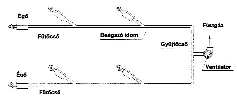 Ezt a rendszert – működését tekintve – alapvetően a gázüzemű blokkégőkhöz hasonlíthatnánk. (2. kép) A szívott rendszerű készülékeknél a ventilátor az égőegységtől elkülönülten a sugárcső és égőcsövek után helyezkedik el. Az „U” csöves kivitelnél az égőblokk és a ventillátorház közös öntvényházba is kerülhet elhelyezésre, így az üzemi zajszint előnyösen befolyásolható az egyenes kivitelhez képest. (3. kép) A szívott üzemmódú sötétsugárzók központi füstgázgyűjtéssel is kialakíthatók. A rendszer abban különbözik a hagyományos típusú, szívott üzemű sötétsugárzóktól, hogy az elszívó ventilátor nem szerves része a készüléknek, hanem egy ventillátorral közös füstgáz-gyűjtőcsőben több készülék füstgáza is elvezethető, kevesebb épületszerkezeti áthatolás szükséges. Egy készülék is telepíthető külön füstgáz-ventillátorral, ami lényegében hagyományos sötétsugárzó, de füstgáz-ventilátor nem kerül kényszerképpen a készülékre, hanem attól távol is telepíthető.
