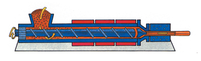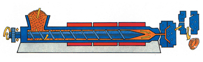 Az alapanyagot egy felfűtött hengerbe vezetik, amelyben egy lassan forgó csiga homogénné keveri, megömleszti, majd átpréseli egy alakadó szerszámon, így alakul ki a termék keresztmetszete. A terméket ezután vízzel lehűtik.
