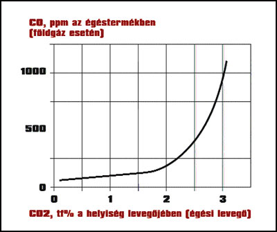 A gáz égéstermékében a következő alkotók vannak: nitrogén az égési levegőből, szén-dioxid mint égéstermék, oxigén, mivel a készülékbe több égési levegő áramlik, mint amennyi az égéshez szükséges („légfelesleg”), jelentős mennyiségű víz, gőz formában, továbbá minimális mennyiségű nemesgázok az égési levegőből. Ha az égéstermék-elvezetés nem eléggé hatásos, sőt hatástalan, akkor a gázkészülék üzeme során a néhány százaléknyi szén-dioxid a helyiség légterébe jut. Ez a jelenség azért veszélyes, mert – mint több szakérői vizsgálat is kimutatta – a helyiséglevegő szén-dioxid-tartalmának növekedésével ugrásszerűen megnő a készülék szén-monoxid kibocsátása, a 2. ábrán látható módon. Ez okozza a viszonylag rövid idő alatt kialakuló, súlyos, sőt halálos kimenetelű szén-monoxid- mérgezéseket. A gravitációs égéstermék- elvezetés lényege – mint ismert -, hogy a gázkészülék indulásakor egyre melegebb égéstermék áramlik az áramlásbiztosítóba, ott keveredik a beáramló helyiséglevegővel, és ez a környezetnél melegebb keverék belép a kéménybe. A kéményben termikus felhajtóerő – huzat – keletkezik, ami legyőzi a kémény ellenállását és az égéstermék a külső térbe távozik. Nyilvánvaló, hogy a kialakuló huzat és így az égéstermék-tömegáram a kémény felfűtése során változik és az időben állandósult állapot, ami egyúttal a tervezett állapot is, csak több-kevesebb idő után áll be.