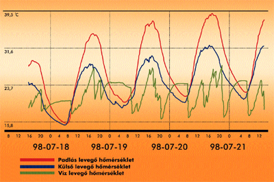 A fizika alapjai szerint a hőáramlások nemcsak térben, hanem időben is lejátszódó folyamatok. Ha tehát megnézzük az ábrán látható görbéket, megfigyelhető, hogy hajnali 5-6 órától kezd jobban emelkedni a padlás levegőhőmérséklete, mint a külső hőmérséklet. Érdekes módon a maximumát 16-17 óra körül éri el, nem délben, mint ahogy első pillanatban gondolnánk. Majd kezdődik a lehűlés, ami a meteorológiai viszonyok függvénye alapján felhős időben lassúbb, tiszta égbolt esetén gyorsabb a kisugárzások miatt. Akkor kell tehát „begyűjtenünk” a hőenergiát, amikor a környezet melegebb, mint a melegíteni kívánt víz. Berendezésünk tehát olyan automatikaelemeket tartalmaz, amely figyeli a padlás és a víz hőmérséklete közötti különbséget. Bizonyos korlátok között csak akkor működik, ha ezekre a kedvező feltételek fennállnak. Egyébként éjszaka kisugározná azt a hőmennyiséget, amit korábban összegyűjtött.