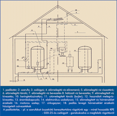 A berendezés elvi kapcsolási rajzán látszik, hogy sok hasonlóság mutatkozik a napkollektoros rendszerekkel, itt azonban jóval egyszerűbb a megoldás. Előnyként kell említeni azt is, hogy nem kell a tetőszerkezethez hozzányúlni, ami általában mindig problémát szokott okozni. Vonatkozik ez az előny a karbantartásra is. Tény, hogy fagyveszélyes időben a födém alatti részekben lévő vizet le kell engedni, ami azt is jelenti, hogy berendezésünk Magyarországon márciustól-novemberig használható biztonságosan. A hálózati vizet az épületbe való belépésekor kettéválasztjuk, a hideg vizet továbbvezetjük a megadott módon, míg a melegítésre szánt másik részét egy előmelegítő rendszeren vezetjük keresztül a hagyományos, most már „utómelegítőnek” nevezendő gáz- vagy villamos energiával működő egységhez. A padlástérben elhelyezett csőkígyóban lassan, de folyamatosan kering a víz, ezáltal fölvéve a padlás levegőjének hőmérsékletét. Ezért a keringtetőszivattyú is aránylag kis teljesítményű lehet.