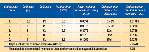 A teljes csőhosszon számított nyomásveszteség kisebb, mint a megengedett elhasználható nyomás, tehát a csőméretek megfelelőek. A méretezés teljes egyidejűséggel lett számolva, ami a biztonság felé viszi azt. A méretezés során a példa egyszerűségénél fogva nem történt interpoláció. Ez jelen esetben megengedhető.