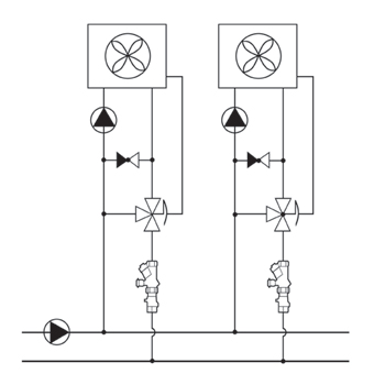 A dinamikus szabályozók a csővezetékekben bekövetkező nyomásváltozások ellenére az előbeállított mennyiséget a szabályozóra jellemző működésmód miatt állandó értéken tartják. A szabályozó előbeállításával a dinamikus rendszer beszabályozottnak tekinthető. Az épületgépészeti gyakorlat dinamikus szabályozó alatt a kapillárcsöves strangszabályozókat érti. Az összeállításunkban szereplő dinamikus tömegáramszabályozó rendszer viszont egy ezt meghaladó szemléletet jelent, amely (az arányos helyett) lapos jelleggörbe szerint működik. Ez biztosítja, hogy a nyomásváltozás ellenére a tömegáram állandó maradhasson. A kiválasztás elsősorban tömegáramra (m3/h) történhet, amely leggyakrabban az egyébként is választott csőmérethez is megfelel. A szabályozó és a keringető szivattyú összefüggésével kapcsolatosan lényeges, hogy a szivattyú emelőmagassága nem haladhatja meg a szabályozó működési tartományát. Ez a biztosítéka annak, hogy a szabályozó dinamikusan működhessen. A szivattyú-emelőmagasság kérdése a normál épületgépészeti rendszereknél leegyszerűsödik, mivel a legalacsonyabb 15-150 kPa működési tartomány az átlagos 80-120 kPa szivattyú-tartományokhoz jól illeszkedik. A szivattyú megválasztásánál a dinamikus szabályozók min. 10-15 kPa nyomásesés-igényét figyelembe kell venni. Vizsgáljunk meg egy osztó-gyűjtőre csatlakozó fűtési kört hőfokszabályozóval és tömegáramszabályozással (1. ábra). Belátható, hogy a háromjáratú szelep bármely állásánál a primer fűtési kör a tömegáramszabályozóval korlátozva van. Ezt az osztó-gyűjtőre csatlakozó valamennyi fűtési rendszernél megvalósítva, a tömegáramok egymáshoz való viszonya arányosan felosztható, az egyes rendszerek ellátása felszeletelhető. Az arányos, igény szerinti felosztás feltétele tehát a tömegáramszabályozó alkalmazása. Ennek elhagyása esetén a rendszerek megosztása a háromjáratú szelepekkel nem megnyugtató, és a nagyobb ellenállású, hidraulikailag kedvezőtlenebb körökben alulellátás keletkezhet. A részletezett megosztást a tömegáramegyensúly biztosításának egyik legegyszerűbb, a hőelosztás irányából kiindulva részleges módjának lehet tekinteni, ahol a fogyasztói körökben még további szabályozás szükséges.