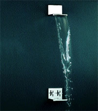 A csapoknak is alkalmazkodniuk kell a szigorú, új rendhez. Az ember tudatában a csap fogalma a mosdócsappal azonosul, így a vevő, ha egy egész garnitúrát szándékozik venni, akkor mindig a mosdócsap alapján választ, ezért a gyártók is erre fordítják a legnagyobb figyelmet. A „fiera”-n a téglalap keresztmetszetű, pengevékony csapok uralták a terepet. A leglényegesebb változás újfent a takarékosság rovására ment végbe. A kitűnően bevált levegőbekeveréssel dolgozó, sok víz látszatát keltő, kör keresztmetszetű perlátorok és kaszkád kifolyóelemek nem építhetők be az új formájú csapokba. Így jobb híján marad a szabad kifolyás. Ezzel a módszerrel az azonos művelethez lényegesen több vizet használnak fel, de úgy látszik, ez nem fontos szempont. Ezt az elvet követi az abszolút újdonságnak számító, nevében is „pengé”-re utaló Blade csapcsalád, melynek az 1. képen a leglátványosabb tagját, a falon belül szerelt zuhanycsapját és a kiömlőt mutatjuk be. A víz egy nagyon vékony résen ömlik ki és szabadon, vízesésszerűen zuhog alá. Látványnak gyönyörű, de a zuhanyozás talán mégis kellemesebb egy egyenletes, irányítható, lágy, szétterülő vízsugárral. A gazdaságosság sem igazán számít, ugyanis ezzel a zuhannyal sok vizet kell egy tisztálkodáshoz kifolyatni. De Olaszországban első a design!