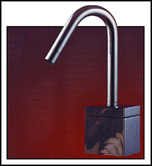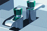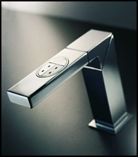 Az elektronika lassan az élet minden területre betör. Találkozhattunk már elektronikus zuhanytermosztátokkal, és láttunk távirányítóval üzembe helyezhető és szabályozható konyhai csapot is, amely az ismétlődő feladatok ellátása céljából még memóriával is rendelkezett. De érintésre működő és szabályozható mosdócsapot (4. kép) a Cersaie-on mutattak be először. A vízszintes kifolyócső tetején lévő nyomógombokkal a csap nyitható-zárható, és külön-külön szabályozható a hideg és a meleg víz térfogatárama. Érdekesség, hogy a kifolyócső függőlegesen mozgatható. Néhány éve feltűnést keltett az az érintés nélkül működő mosdócsap, amelynél a kezet a csap elé helyezve a csap nyitott, és a víz hőfokát a kéznek a kifolyóelemhez viszonyított távolságának változtatásával lehetett szabályozni.