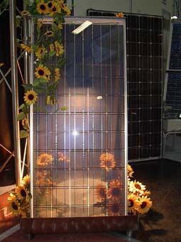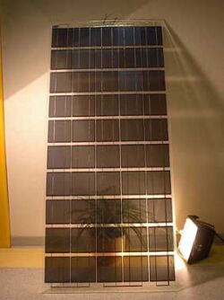 Meglévő elektromos hálózatba visszatöltő napelemes rendszer esetén a fotovillamos berendezés egy arra alkalmas inverteren keresztül össze van kötve az utcai hálózattal. A nappal termelt, fel nem használt villamos áramot az áramátalakító egység 230 V-ra konvertálja, és a helyi áramszolgáltató megvásárol(hat)ja, a mennyiséget egy második villanyóra mér(het)i. A feltételes mód ebben az esetben jogos, mert jelentős akadályok tornyosulnak a magyarországi áramértékesítés előtt. Az ELMÜ, illetve a többi szolgáltató különböző szabályozást alkalmaz, de egyezik az álláspontjuk abban, hogy állandó modemes kapcsolat és telefonvonal kiépítését kérik, hogy ellenőrizzék a rendszert. Pedig valószínűleg – és logikusan – elég lenne a mérőóra, Németországban legalábbis így van, és mindenki elégedett. Ezen okok miatt általában „szigetrendszerek” kerülnek kiépítésre, ahol a termelt áram akkumulátorokban tárolódik. Esténként aztán ez a tárolt villamos áram kerül felhasználásra. Az általunk megismert napelemes modul cellái az optikai hatásnak köszönhetően csaknem feketék. A polikristályos cellák – felületi szerkezetük révén – akár 15%-os hatásfokot is elérhetnek. Felületük szabálytalan kúpos mikroszerkezetű. A „családi házas” méretű készülékek 120-160 W teljesítményűek, méretük kb. 1 m2, súlyuk 12-15 kg.
