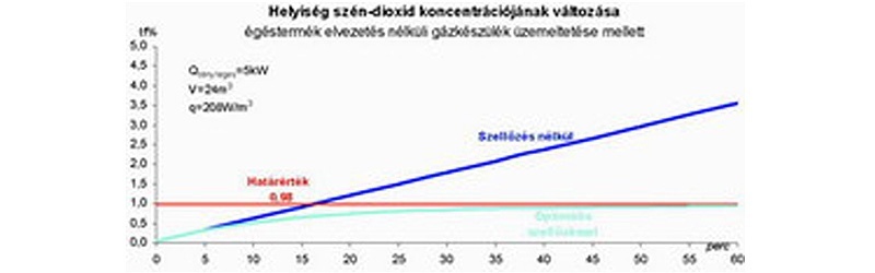 A mellékelt diagram szemlélteti 5 kW-os hőterheléssel egy V=24 m³-es konyha légterében a szén-dioxid-koncentráció változásának tendenciáját az idő függvényében. A kezdeti szakaszán lineáris egyenes mutatja a szellőztetés nélkül kialakuló koncentrációt, míg a határérték alatti görbe mutatja a számított szellőztetés melletti koncentrációt. A diagram a korábban használt légtérterhelési megítélés alapvető elvi hibájára mutat rá, ugyanis megfelelő légtérterhelés mellett rövid időn belül az egészségügyi határérték feletti koncentráció jön létre.