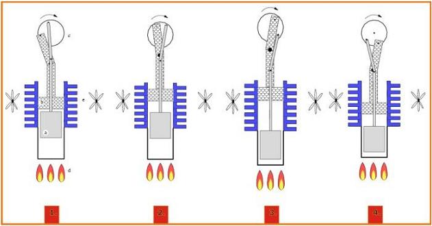 A Stirling-motor egyik változatának vázlata látható az ábrán. Az 1. ütemben az alsó munkadugattyú alatti térben a gáz felmelegszik, kitágul és felfelé nyomja a munkadugattyút. Ez a munkaütem. A felső holtpont után a munkadugattyú lefelé mozdul el és átnyomja a gázt a hideg térbe, eközben a másik dugattyú még felfelé mozog, így a hűtő henger térfogata nő. A 2. ütem az átáramoltatás. A 3. ütemben a hideg kamrában lévő gáz fokozatosan lehűl. Végül a hideg gázt a másik dugattyú átnyomja a meleg hengerbe (4. ütem) és a folyamat kezdődik elölről.