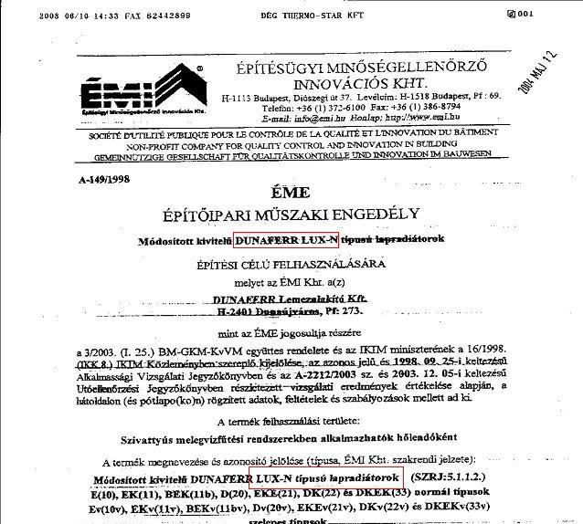 „(…) A tárgyi lapradiátorok, mint építési termékek műszaki követelményeinek, megfelelőség igazolásának valamint forgalomba hozatalának és felhasználásának részletes szabályairól a 3/2003. (I. 25.) BM-GKM-KvVM együttes rendelet rendelkezik. Ennek megfelelően a LUX-N és a LUX-uNi lapradiátorokról az ÉMI Építőipari Műszaki Engedélyeket (ÉME) adott ki a DUNAFERR Lemezalakító Kft részére. ( A LUX-N lapradiátorokról utoljára 2004. 04. 22.-én – lásd az Önök által beküldött dokumentum -, majd a LUX-N és a LUX-uNi lapradiátorok engedélyeinek A-149/1998 számon történő egyesítésekor 2005. 09. 26.-án. )