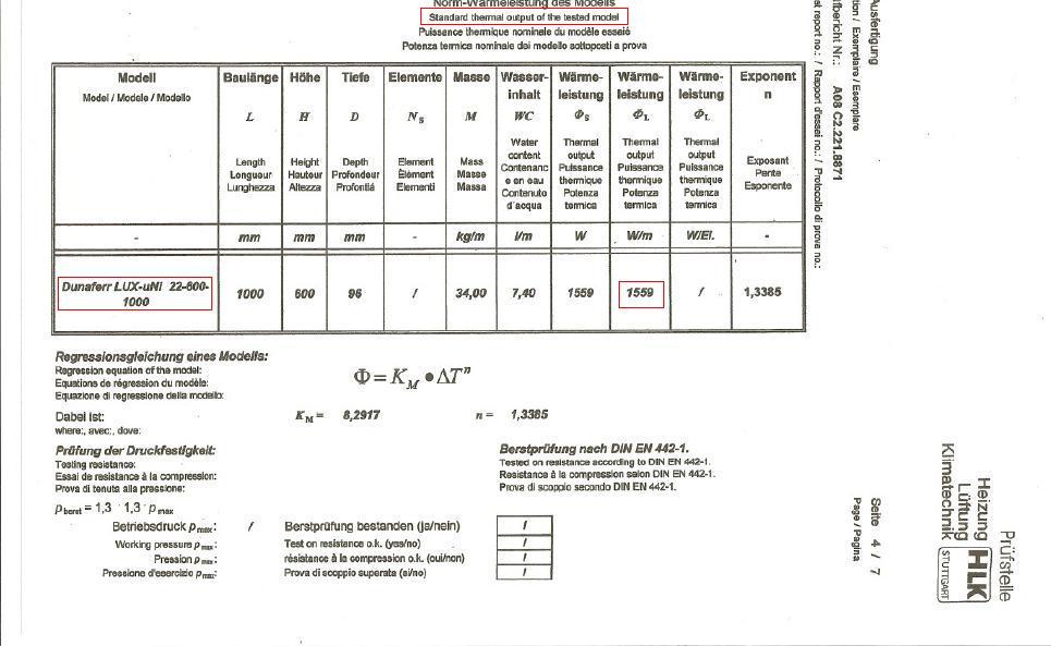 Birtokunkba került egy vizsgálati jegyzőkönyv eredménye, amelyet az Institut für GebäudeEnergetik Universität Stuttgart végzett (6. kép) A Lux-uNi radiátorra mért adat 1559 W/m, vagyis 19%-kal kisebb a VGF júniusi számában lévő táblázatnál, és 14%-kal kisebb a jótállási jegyen lévő adatnál.