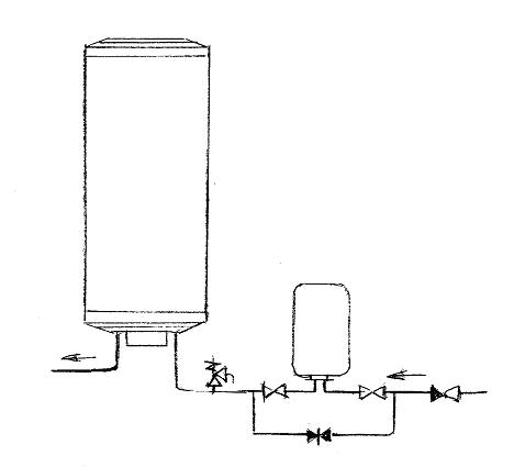 A vázlat szerinti megoldás másik sajátossága, hogy az elektromos üzemű zárt forróvíztárolókhoz rendszeresített kombinált szelep funkcióit szétválasztja a bekötésen: a szerelvénysor külön visszacsapóval kezdődik. Az átkötő (bypass) szakaszon jelölt csapot elzárt állapotában tartjuk. A kétcsonkos tágulási tartály előtti/utáni szerelvények üzemben nyitva vannak, annak esetleges kiszerelésénél lehet szerepük, amikor viszont a megkerülőn engedjük a vizet a bojlerbe. A tárolóhoz legközelebbi, utolsó armatúránk egy közönséges biztonsági szelep, amelynél meghagyhatjuk az ürítési funkciót is.