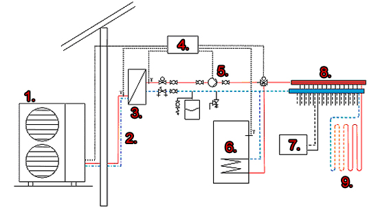 | 1. Levegő hőszivattyú 2. Folyadék/gáz hűtöközeg, vezetékek 3. Inox/Dx/víz hőcserélő 4. PCB 5. Elektronikus szivattyú 6. HVM tárolótartály 7. Fancoil fűtés/hűtés 8. Osztó/gyűtjő 9. Padlófűtés vagy felület fűtés/hűtés |