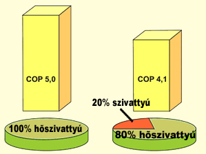 Az is nyilvánvaló, hogy a levegős hőszivattyúk hatékonysága jelentősen függ a külső hőmérséklet alakulásától. Egy -15 ºC külső hőmérséklet mellett üzemelő levegős hőszivattyú COP-ja köszönő viszonyban sincs a névleges +7 ºC-on mért jósági fokkal. Azonban, ha gazdaságossági szempontból vizsgáljuk levegős gépünket, egészen más következtetésre juthatunk; tudniillik ha figyelembe vesszük azt, hogy egy jelenleg piacvezető levegős hőszivattyú +7 ºC-on rendelkezésre álló 4,4 COP értéke – egy megfelelően hőszivattyús üzemre tervezett rendszerben - hozzávetőleg -5 ºC külső hőmérsékletig működik a bűvös COP-egyenérték = 3,1 felett, akkor a magyarországi időjárási viszonyok mellett a fűtési szezon jelentékeny – a jól becsülhető hideg napok kivételével teljes - részében gazdaságosabban üzemeltethető, mint gáz energiaforrás felhasználásával. Az energiaárak várható alakulásának, valamint a remélhetőleg bevezetésre kerülő hőszivattyús tarifának köszönhetően rövidesen egyáltalán nem lesz kérdés a levegős hőszivattyúk alkalmazása. A hőszivattyúk piacán egyértelmű áttekintést tesznek(tenne) lehetővé a már működő on-line mérések, vagyis ellátogathatunk olyan hőszivattyú-teszt weboldalakra, ahol a hőszivattyúkat működés közben, élőben tanulmányozhatjuk, letölthetjük a korábban mért adatokat. Ezzel nemcsak a leendő tulajdonosok, de a szakma is átfogó tapasztalatokra tehet(ne) szert.
