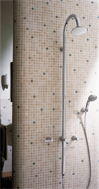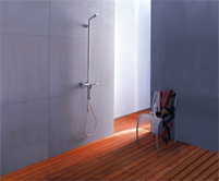 A rendkívül karcsú „zuhanyoszlopok”-at helyezi előtérbe. A felújításoknál a meglévő, 1100-1200 mm magasságú, 150 mm kötéstávolságú kiálláshoz egy kétfogantyús vagy termosztátos kezelőegységgel rendelkező, fej- és kézizuhanyból álló zuhanyoszlopot csatlakoztatunk (1. ábra). A fejzuhany csövének keresztmetszete a dizájner ízlése szerint a körtől az ellapított téglalapig változhat, annál is inkább, mert a víz átvezetésére az oszlopon belül egy flexibilis vezeték szolgál. Az oszlop aljához csatlakozik a kézizuhany gégecsöve, s a zuhany az oszlopra akasztható. A kifolyó, kevert víz váltóval irányítható a kívánt zuhanyhoz. A 2. ábrán bemutatott, kétségkívül nagyon elegáns zuhanyoszlop szerelési szempontból különös figyelmet igényel! A vízcsöveket az előre a falba épített E-idomhoz kell csatlakoztatni, ráadásul, úgy hogy a csatlakozási pontok egymástól 200 mm-re legyenek. Sajnos, ez a megoldás – nagyobb bontás nélkül – többnyire csak az új szereléseknél alkalmazható!