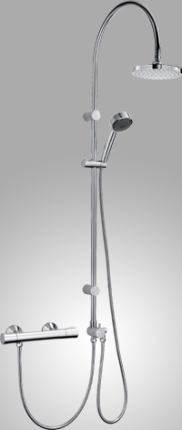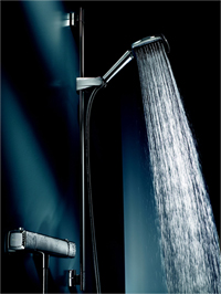 Ha csak egy kézizuhanyt szeretnénk működtetni, akkor a célszerűen falirúddal együtt szerelt zuhany gégecsövét a termosztáthoz kell csatlakoztatni. Felfigyelhetünk a különösen bő vízsugárra, mely a hatalmas, 130x130 mm-es, lapos zuhanyból záporoz. Újdonságnak számít, hogy a kézizuhany feje a fogantyúhoz képest több fokozatban dönthető, és az is, hogy zuhany a rúddal a tartóval együtt fordítható el. Ha az új trendeknek megfelelően, egy korábban bemutatott „zuhanyoszlopot” szeretnénk a fürdőszobánkban tudni, akkor a gégecsövet a komplett zuhanyoszlophoz csatlakoztathatjuk (5. ábra). A rendszer kezelését különösen kényelmessé teszi, hogy a kézizuhany a csövön mozgatható, állítható magasságú csúszkába illeszthető, s így a gyerekek akár „fejzuhanyként” is használhatják. Figyelmet érdemel a nagyméretű tányérzuhany, ami kellemes, bő vízsugarat alakít ki, de ennek hatása természetesen a vízszámlán is meg fog mutatkozni. A víz rugalmas, műanyag fúvókákon áramlik ki, melyekről a vízkő gyorsan és egyszerűen eltávolítható.
