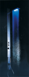 Azok a gyártók, akik ragaszkodtak a zuhanyblokkokhoz, kénytelenek voltak alkalmazkodni az új trendhez. Amellett, hogy a megújított panelek karcsúsodtak-keskenyedtek, olyan vevőcsalogató látványelemeket is bevetettek, mint például a vízsugár megvilágítása (3. ábra). Ha a régi zuhanyt ki akarjuk cserélni, és a meglévő csatlakozástól egy kicsit távolabb szeretnénk elhelyezni, akkor a 4. ábrán látható változat lehet a megoldás. Az átalakítás alkalmával a régi keverőcsapot is célszerű termosztátos zuhanycsappal helyettesíteni! Az ajánlott armatúra megvéd a hőfokingadozásoktól. 38 °C-nál nagyobb hőfokot csak a termosztát gombján lévő retesz feloldása után lehet beállítani, így a termosztát a biztonság érdekében óv a feleslegesen nagy vízhőfok akaratlan beállításától, és egyben az energiatakarékosságra is figyelmeztet. A jobb termosztátok forrázásgátló funkcióval is bírnak, ami azt jelenti, hogy a zuhanyból még a hideg oldal teljes kiesése esetén sem áramolhat ki veszélyesen forró víz. A hőfokingadozás és a leforrázás veszélyének kiküszöbölése a gyors menekülésre kevés esélyt nyújtó, zárt zuhanyfülke esetében is biztonságossá teszi a tisztálkodást.