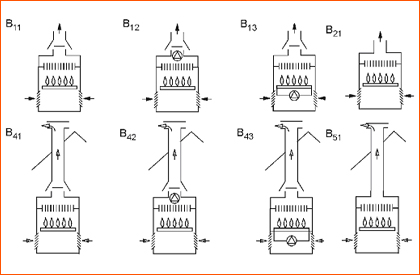 A B11, B12, B13, B21, B41, B42, B43, B51 típusú készülékek (2. ábra) épületek huzamos emberi tartózkodásra szolgáló helyiségeiben és az azokkal légtér-összeköttetésben lévő mellékhelyiségekben nem helyezhetők el, kivéve, ha az égéstermék-elvezetés mesterséges, vagy az égésilevegő-hozzávezetés a helyiségben túlnyomással biztosított. Mindkét megoldásnál a gázfogyasztó készülék működését a fenti feltételek meglétéhez reteszelni kell.