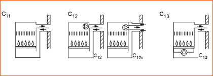 - „C” típusúak azok, amelyek égéstere hermetikusan el van zárva a felszerelési helyiségtől, tehát az égési levegőt a szabadból veszik, és az égésterméket is a szabadba bocsátják ki.