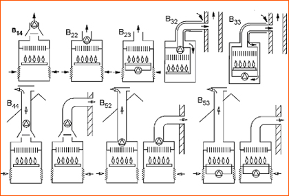 -„B” típusúak azok, amelyek a felszerelési helyiségből veszik az égési levegőt, de a kültér felé égéstermék-elvezetőn keresztül (általában kémény) bocsátják ki az égésterméket,