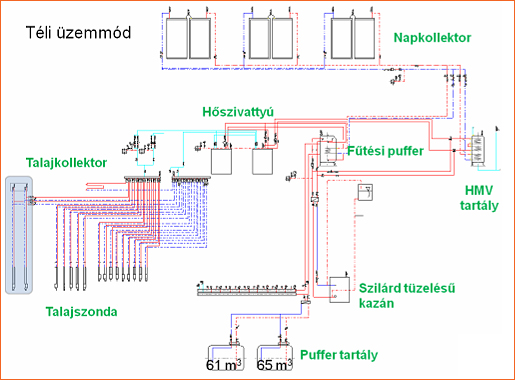 Az irodaépület fűtési és használati melegvíz-igényének ellátását ezen kívül napkollektor és hulladékhasznosító kazán is segíti. Nyáron a hűtést passzív talajszondás rendszer biztosítja. Mivel az épület egész éves működését vizsgáljuk, ezért a projekt helyszínén nemcsak a megnevezett megújuló energiaforrások alkalmazása történik, hanem a környezet és a rendszer pontos megfigyelése a kialakított épületfelügyeleti szoftver segítségével. Jelen cikkben az alkalmazott épületgépészeti rendszer speciális, téli üzemmódját mutatjuk be, különös tekintettel a felgyülemlett üzemeltetési és kutatási tapasztalatokra.