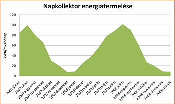 Az ikertartályhoz kapcsolódik 6x2,63 m2 (abszorberfelület: 6x2,41 m2) felületű síkkollektor. A napkollektorok által megtermelt energia kb. harmadát tároljuk el a tartályban, ugyanis a kollektorok harmadik prioritása az ikertartályok temperálása. 2008 nyarán négyzetméterenként átlagosan 30 kWh energiával temperáltuk a tartályt [1. ábra].