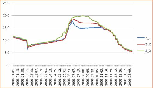 A kutatási projekt során 2008 nyarán a tartály átlaghőmérséklete elérte a 20 °C-ot, mely energiát a 2008/2009-es fűtési szezonban a hőszivattyú segítségével hasznosítottuk. A tartályt a fűtési szezonban 15 °C-ról lehűtöttük 5,3 °C-ra, ?T = 9,7 °C = 282,5 K [2. ábra].