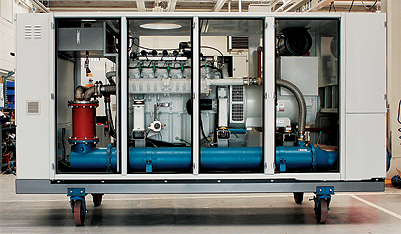 Az 1. kép egy gázmotoros kiserőművet mutat. A felépítmény tartalmazza a motorblokkot, generátort, vezérlést, hőcserélőket és egy speciális zajvédő burkolatot, amely lehetővé teszi csendes helyekre történő telepítését.