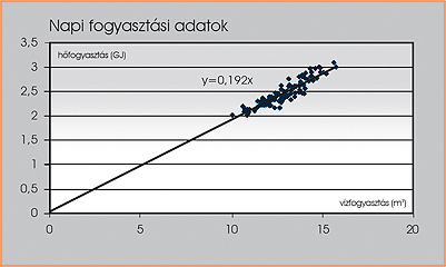 (korrigálva) max. 35% megtakarítást hozott a beruházás nyáron. Ez első látásra nem valami fényes. Ha kicsit engedünk az összehasonlítás megkérdőjelezhetetlensége követelményének szigorából, akkor becsülhetünk egy reális téli fajlagost! A „kollektorizálás” előtti napi fogyasztások a 2. ábrán figyelhetők meg.