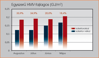 Ezért itt az egyszerű HMV-fajlagosok összehasonlítása lehet célszerű, azaz a korábban vízfelmelegítésre felhasznált hő mennyiségét a fogyasztott vízre vetíteni. Ha a termelésbe besegítenek a kollektorok, akkor kevesebb kell az eredeti hőforrásból származó energiából, ugyanahhoz a vízhez tehát kisebb lesz a fajlagos. Ezt a számítást azonban többnyire igazán csak a fűtésmenetes időszakokra lehet elvégezni. Helyesebben a számítást el lehet végezni minden időszakra, de az összehasonlításnak csak a nyári hónapokra van értelme, mert a „kollektorizálás” előtti fűtéses időszakokra csak származtatott HMV-fajlagos állhat rendelkezésre, ami – valljuk be – vajmi keveset ér (mert ahogyan legtöbbször, ebben a konkrét esetben sem volt a beruházás előtt külön HMV-hőmennyiségmérés). Ezzel a kiigazítással az 1. ábra eredményeire jutunk.