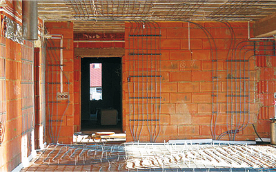 a padlófűtésnél is olcsóbb és hatékonyabb az úgynevezett falfűtés. Amikor a napsugarak felmelegítik a ház falát, mi magunk is tapasztalhatjuk a falak hőtároló képességét és az onnét kiáramló hő kellemes sugárzását, ráadásul az így „visszatükrözött” meleget a valóságosnál magasabb hőmérsékletűnek érezzük Ugyanezen az elven működik a falfűtés is (2. kép): nem kell többre állítanunk a szabályozót, mint 20 °C, és mégis kellemes, 23 °C-osnak érezzük a lakás hőmérsékletét. Emiatt tehát a falon belül – a 2 méteres magasságban beépített csövekben – keringő vizet jóval kevesebb energia felhasználásával tudjuk felmelegíteni, így a számlánkon jelentkező összeg máris kisebb lesz. (A fűtővíz hőmérséklete mindössze 30-40 °C). Nagy előnye még a falfűtésnek, hogy a rendszer felfűtési ideje rövid, és ha a vakolat nem vastag, a kisugárzó hő rögtön kellemes meleget varázsol lakásunkba, házunk helyiségeibe. Az említettek nyomán, ha falfűtésre cseréljük hagyományos rendszerünket, a fűtési energia-megtakarítás akár a 20%-ot is meghaladhatja!