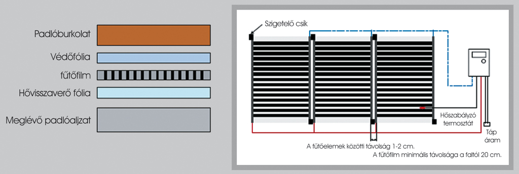 A fűtőfilm fő elemét, az ezüsttel kevert szénpasztát, speciális nyomdai eljárásokra hasonlító módszerrel hordják fel a rétegezett polietilén (PET) fóliára. A szénpaszta áramellátásának biztosítására rézsínt és ezüst összekötő elemeket visznek fel, majd az így kapott konstrukciót egy erre a célra kialakított speciális kemencében magas hőmérsékletű hőkezelésnek vetik alá. A végeredmény egy rendkívül stabil, időtálló, kiváló mechanikai tulajdonságokkal rendelkező energiatakarékos fűtőfilm. A fűtőfólia háromféle szélességben elérhető, ennek köszönhetően bármilyen méretű és geometriájú helységben alkalmazható.