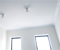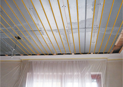 Nem kell szétverni az épületet. Elegendő egy pár centis álmennyezetet készíteni, ebben elhelyezhető a fűtőfelület és elvezethető az összes gerincvezeték a gépház felé. Nem kell megbontani a padlót, csak ott, ahol a mennyezetet kell átfúrni a függőleges csőelvezetések miatt. Gyakorlatilag a mennyezet lefestésével a munka be van fejezve, a fűtőfelületek nem látszanak, helyet nem foglalnak, nem balesetveszélyesek.