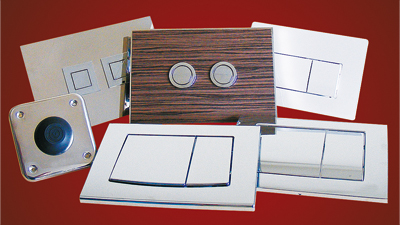 – leginkább bennünket, szakembereket érintő, de – falba eldugott részéről volt szó, pedig fontos lehet a falon kívül megjelenő felület is. Ezen a fronton is zavarba ejtő kínálattal állunk szemben, hiszen vannak olyan gyártók, ahol több mint 250-féle nyomólap és működtető közül választhatunk. A legegyszerűbb ABS mechanikustól az inox és a lopásvédett kivitelen át egészen a kővel vagy fával burkolt pneumatikus design nyomólapokig bezárólag, de említhetném a lábbal működtethető megoldásokat is (6. ábra).