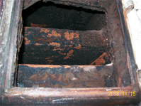 Az első két fényképen egy 1973-ben gyártott lemezkazán látható – úgy, ahogy a szénfűtést abbahagyták valamikor 1985-ben. Látszik, hogy a kazán elsejében „tálcák” vannak – azaz a forró füstgázok megkerülik a vízzel telt elemeket.