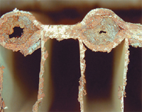 Az oxidáció tehát folyamatossá válik. Az oxidáció káros hatását először nem lyukas csövek vagy radiátorok formájában tapasztaljuk, hanem a korróziós iszap megjelenésében (2. ábra). A korrózió okozta lebegő szennyeződés a vízrendszerben keringve egyre több problémát okoz, még akkor is, ha egyébként egy megfelelően kiválasztott iszapleválasztó is beépítésre került. A korszerű hidraulikai rendszerekben manapság egyre gyakrabban alkalmazott nyomáskülönbség-szabályozók, nyomáskiegyenlített kompakt szelepek, kombinált fan-coil szelepek – a kis résméretek miatt – érzékenyebbek a lebegő szennyeződésekre, mint a régebbi berendezések! Az eltömődött, „megszorult” vagy zárásképtelen szelepek javítása, tisztítása komoly költséget jelent az üzemeltetőnek! Mivel a hibajelenségek többnyire fokozatosan alakulnak ki, sokszor csak azt vesszük észre, hogy valami nincs rendben, de a probléma okát nehéz megtalálni.