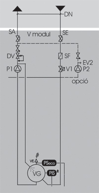 Költséghatékony megoldásként a gáztalanítót egy nyomástartó berendezésbe építik be és/vagy összeépítik egy automatikus vízutántöltővel. A utántöltővel egybeépített berendezések többnyire már képesek a belépő hálózati víz gáztalanítására is, így a rendszervizet már „gáztelítetlen” folyadékkal lehet pótolni. A 6. ábra egy vákuumos gáztalanító elvi kapcsolási sémáját mutatja.