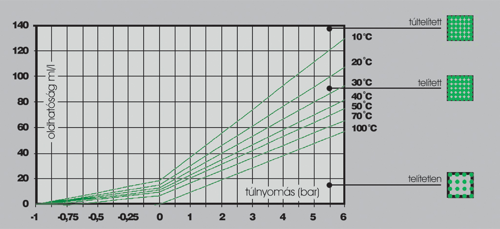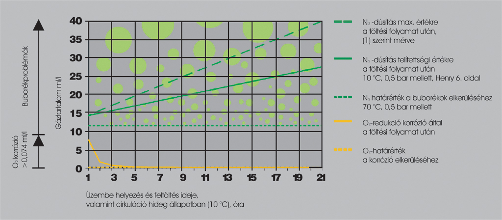Az oxigén rendkívül reakcióképes gáz. Ezt bizonyítja, hogy nagy acél-részaránnyal rendelkező rendszerekben az oldott oxigéntartalom – a korrózió által viszonylag gyorsan – már néhány órával a feltöltés után 7,8 ml/l értékről 0,07 ml/l értékre csökken (1. ábra). Ennek akár örülhetnénk is, de a probléma az, hogy a telítetlenné vált folyadék, szivacsként próbálja magába „szívni” az egyensúlyi állapothoz szükséges oxigénmennyiséget. A vízutántöltésből és a rendszer kialakításától függően bejutó levegőből – például nyitott tágulási tartálynál – ez meg is valósul.