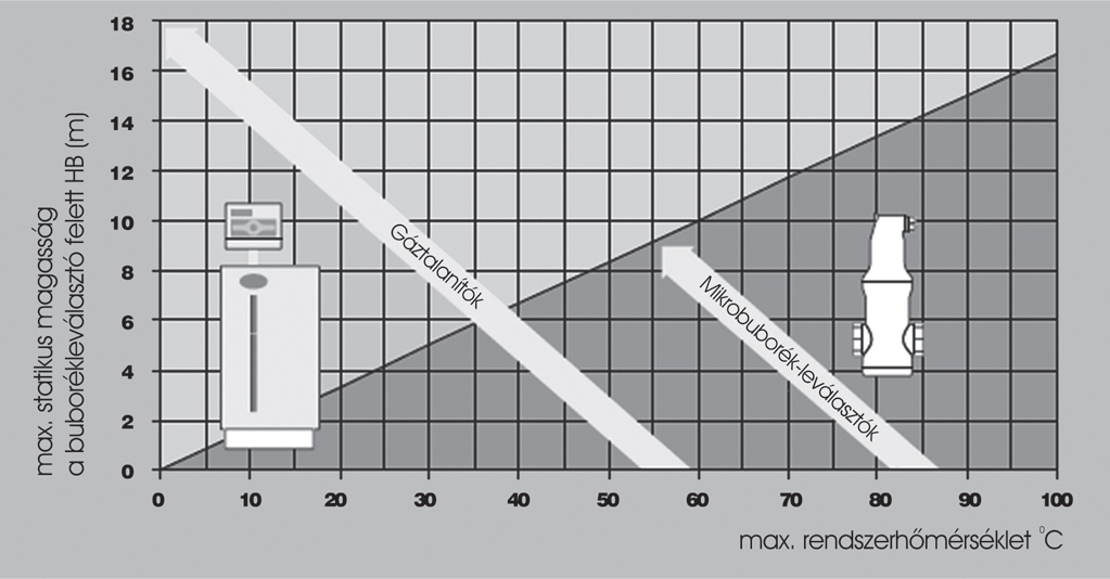 Természetesen ez az elhelyezés nem mindig lehetséges, de törekedni kell a lehető legnagyobb hőmérsékletű és legkisebb nyomású pont megtalálására. Ne felejtsünk el számolni a mikrobuborék-leválasztó és/vagy iszapleválasztó hidraulikai ellenállásával, mert – különösen egy rosszul kiválasztott iszapleválasztó – kellemetlen meglepetést tud okozni.