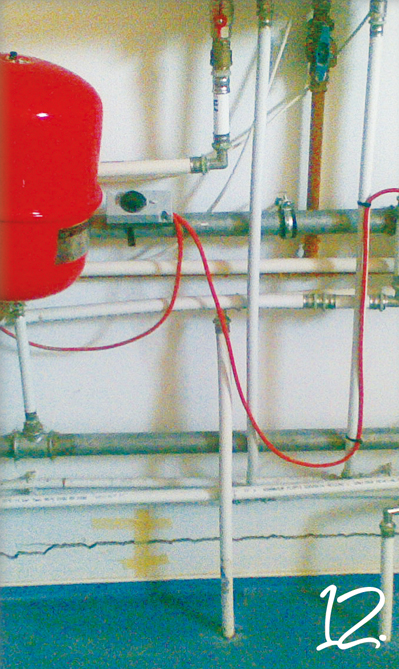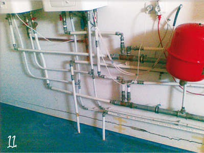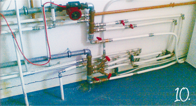 | 10-12. "Mellékelem a képeket, amelyeken látható rendszer egy 600 m2-es lakóotthon fűtését lenne hivatott kiszolgálni. Három darab 24 kW-os kazán a melegvíz-ellátást lemezes hőcserélővel „biztosítja” 30 fő részére." |