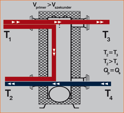 alatt jelenleg Magyarországon csak a fogyasztói oldal változó térfogatáramát értjük. A hazai beruházói, tervezői és kivitelezési szokásokat figyelembe véve (a hűtéstechnika területén szinte biztosan) állandó térfogatáramú termelői oldal kerül tervezésre, kiépítésre. A hűtéstechnikában ezt azt jelenti, hogy az állandó térfogatáramú folyadékhűtő és a változó térfogatáramú fogyasztói hálózat hidraulikus váltóval van leválasztva egymástól. Azonban az üzemeltetési költségek területén az igazi megtakarítási lehetőség (kompresszorok, kondenzorotok ventilátorai, primer keringtető szivattyúk villamos fogyasztásának csökkentése) a termelői oldal megfelelő kialakításával lenne lehetséges (például több folyadékhűtő kaszkádkapcsolása, változó térfogatáramú elpárologtatók, megfelelő expanziós szelepek és automatika), ez azonban olyan többletköltségeket jelent szerelvényezettségben, szabályozásban, amit a beruházói kör egyelőre nem tud vagy akar elfogadni. A fűtéstechnika területén az állandó vagy változó térfogatáramú termelői oldal kérdésköre a kondenzációs kazánok alkalmazása esetén igen meghatározó. A kis vízterű kondenzációs kazánokat általában hidraulikus váltóval választják le a változó térfogatáramú fogyasztói oldalról. Amikor csökken a fogyasztói oldal igénye, a szelepek lezárnak, a fogyasztói oldal frekvenciaváltós szivattyúja visszaszabályoz, és kevesebb fűtővizet szállít. Mi történik eközben a termelői oldalon? Mivel a kondenzációs kazánok már önmagukban is drágábbak, mint hagyományos társaik, ezért a termelői oldalon a kondenzációs ka- zánok keringtető szivattyúi általában nem frekvenciaváltósak. Így amikor a fogyasztói oldal szivattyúi visszaszabályoznak, és ezt nem követik a termelői oldal szivattyúi (mert állandó fordulatszámúak), akkor a hidraulikus váltón keresztül a primer oldali előremenő fűtővíz elkezdi felmelegíteni a primer oldali visszatérő fűtővizet.