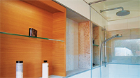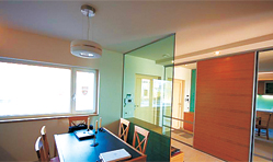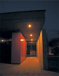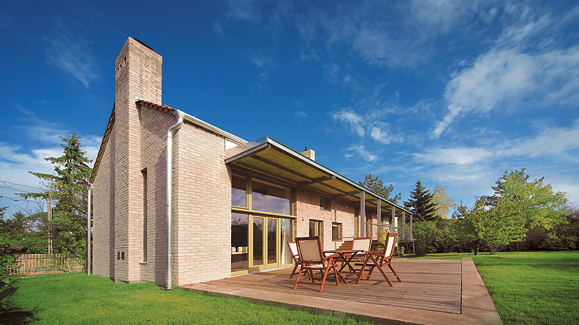 Ebből adódóan északra, az utca felé zárt homlokzatú az épület. A nappali–étkező előtt lévő nyitott terasz az év nagy részében szinte megkétszerezi a közösségi terek alapterületét. A ház természetes klímáját a vastag téglaburkolatos falak, valamint a nappali és a szobák nagy üvegfelületei előtt végigfutó vízszintes, tornácszerű előtető-árnyékoló biztosítja.”