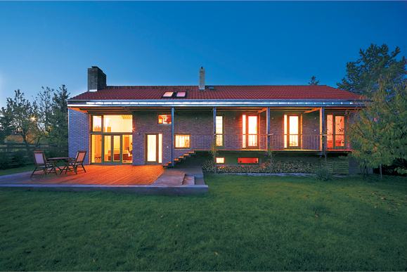 2011-ben a pályázaton az elmúlt években megvalósult családi házak közül 22 mérettetett meg a zsűri előtt. Cél, hogy minden évben olyan építészek válasszák ki az Év Házát, akiket a magyar és az építésztársadalom elismer. Ezen okból kifolyólag a szakmai szervezetek elnökei és az állandó zsűritagok mellé minden évben meghívást kapnak az elő- ző évben Ybl Miklós-díjjal kitüntetett épí-tészek is. 2011-ben mind az öt Ybl-díjas építész támogatta munkájával az Év Háza pályázatot. Mielőtt a Dunakeszin épült négylakásos passzívházat bemutatnánk, ejtsünk néhány szót az „Év Háza” díj nyerteséről is, amely idén a Földes László és Balogh Csaba Nagykovácsiban épült Acéltornácos ház névre keresztelt családi háza lett. A ház bemutatásához az építészeti műleírásban szereplő gondolatokat idézzük: „A ház tervezett kialakítása a megrendelővel történt egyeztetések során kapta a terven szereplő funkcionális elrendezést és formai kialakítást. A hosszúházas alaprajzi kialakítás védettséget, kert felé fordulást, az intimszféra megőrzését szolgálja.